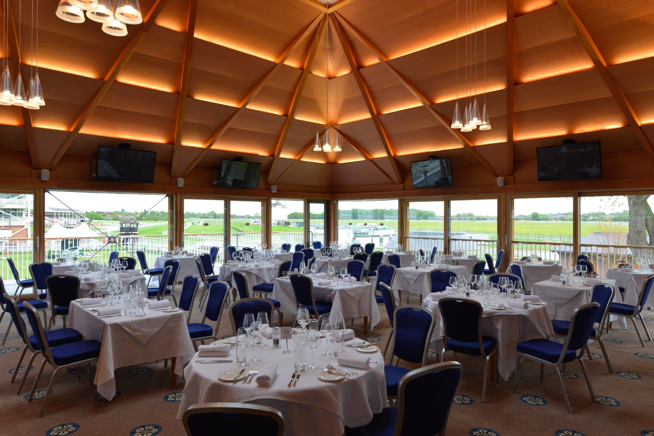 The private balcony offers a stunning view of the thoroughbreds as they prepare to enter the Knavesmire track, with the main stands and course itself spreading out towards the horizon.